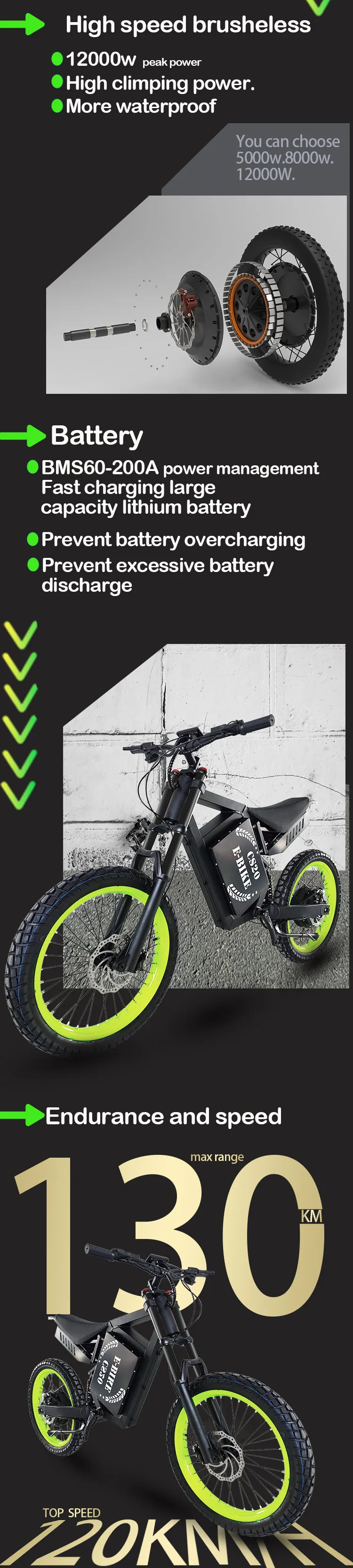 Aviation grade aluminum 6061 frame, 80A controller, 3.0*17 inch kenda motorcycle tires, Front and rear hydraulic disc brake 203mm, Air and oil spring front fork, KS291 adjustable oil spring rear shock, SW900 LCD display, motorcycle seat, PAS, 5A charger, Range 100 to 110km.