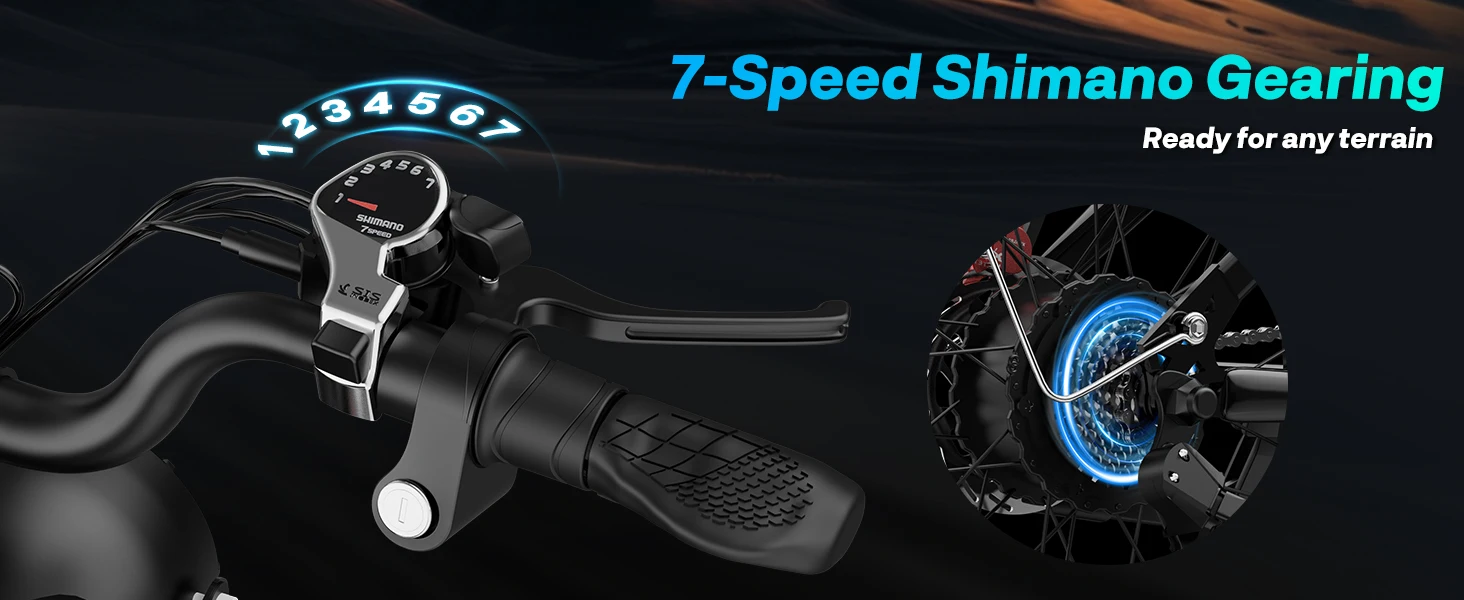 【Shamano 7-Speed & F/R Shock Absorber】Our electric dirt bike for adults features a high-strength front suspension and rear suspension fork that effectively absorbs shocks and provides better control while riding. The Shamano 7-gear shifting allows for reliable precision and comfortable ride control.